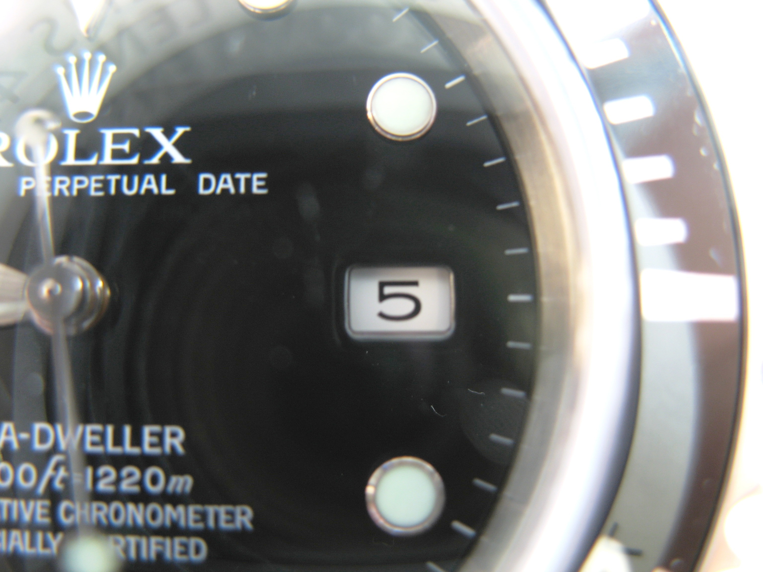 シードゥエラーでは深海での水圧を考慮して、サイクロップレンズは 装備されていません。視認性に欠けますが、すっきりした印象がします。 午前0時を迎えるとほぼ同時(数分ずれることもあります)に日付が替わる デイトジャスト機構は、ロレックスが1945年に特許を取得しました。