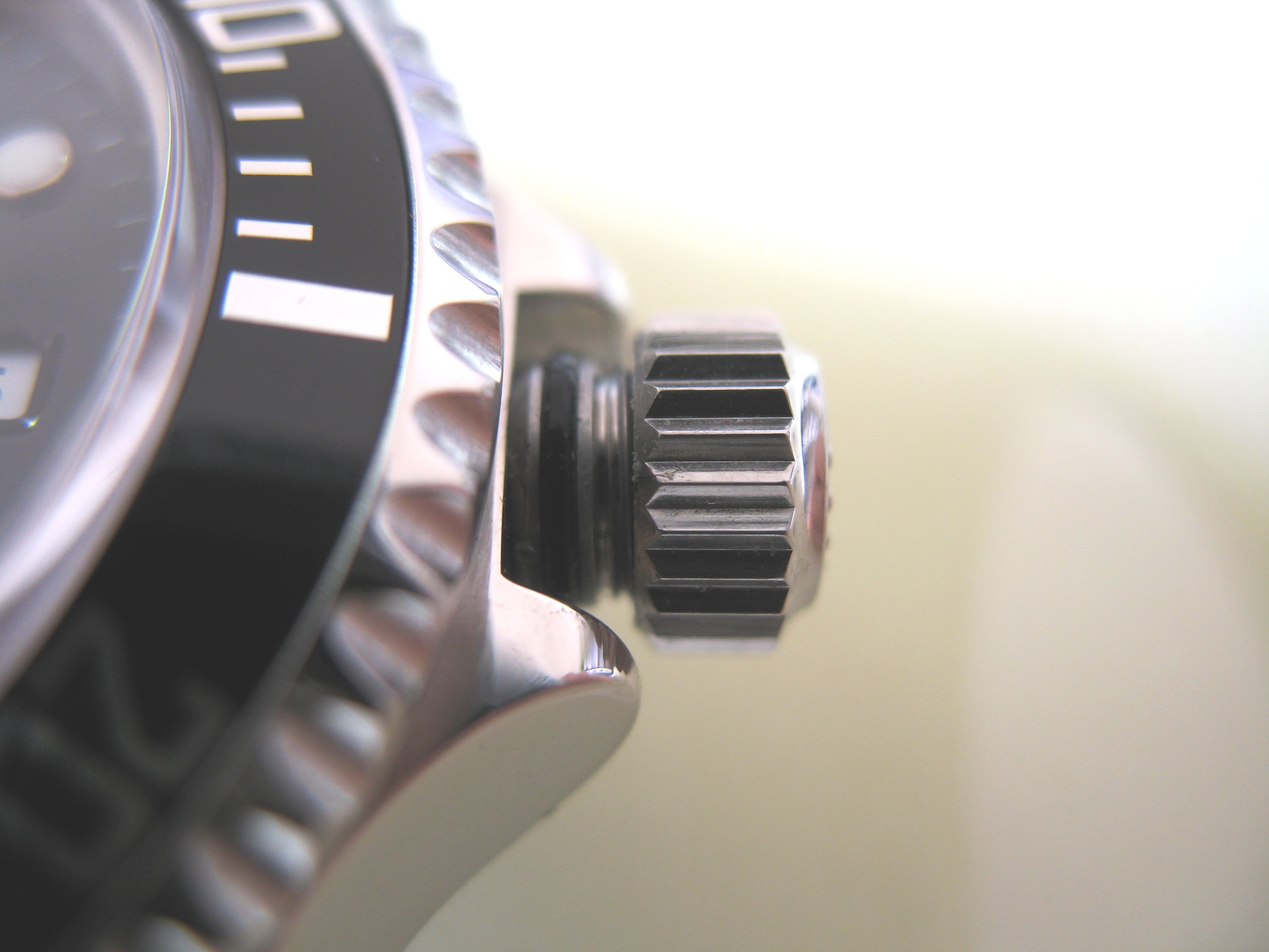 リューズを反時計回りに回すと、画像のようにゴムのパッキンが現れます。 このゴムに圧力をかけてリューズをねじ込むことにより、 リューズ内部の機密性を保ちます。 一段階リューズを右へ引くと、ゼンマイの巻上げ、 二段階引くとカレンダーの調整、 三段階引くと時刻合わせを行うことができます。